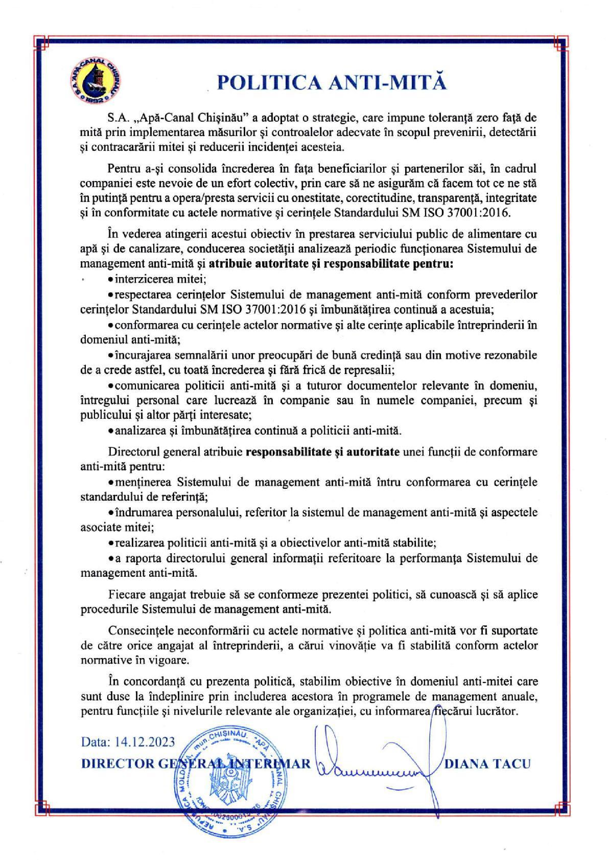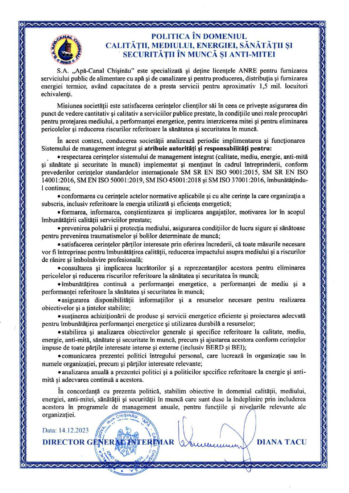 Politica în domeniul calităţii,mediului,energie,sănătăţii şi securităţii în muncă,anti-mită şi securităţii informaţiei